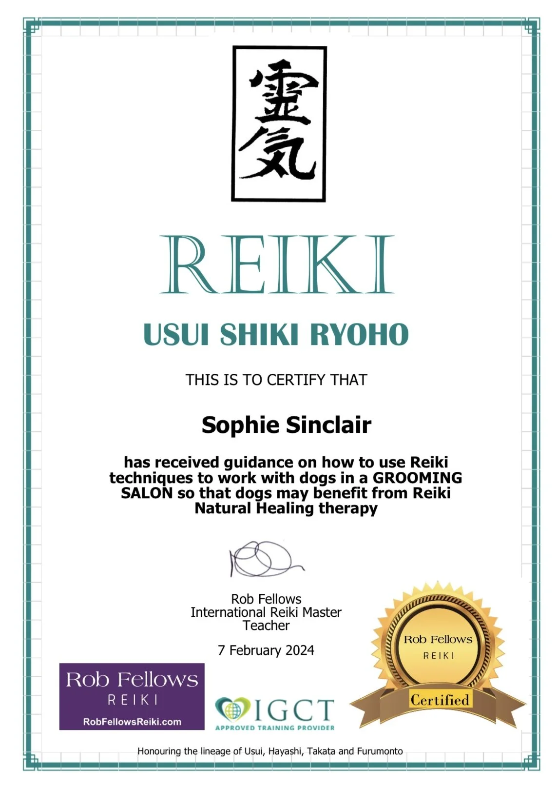 I am also a fully certified and trained Reiki Practitioner both for humans and animals, especially in the dog grooming setting. This has not only massively helped me along this journey, but also all the lovely animals I encounter and pamper.